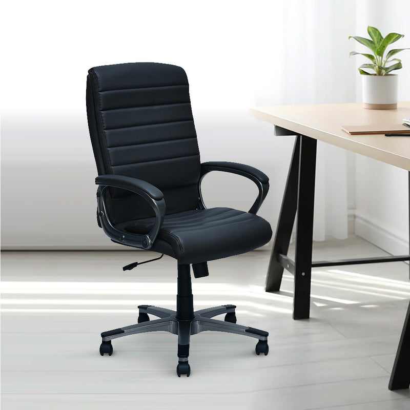 • The Nilkamal Bold Office Chair features a high-back design that supports your entire spine, while nylon and PU fixed armrests add extra comfort. Its foam-padded back and seat, upholstered in durable PU, ensure lasting comfort throughout the day. You can easily adjust the chair’s height with the smooth 100 mm gas lift. The centre-tilt mechanism with an upright lock lets you recline effortlessly when needed. A strong nylon star base and nylon castors allow you to move around your workspace with ease.