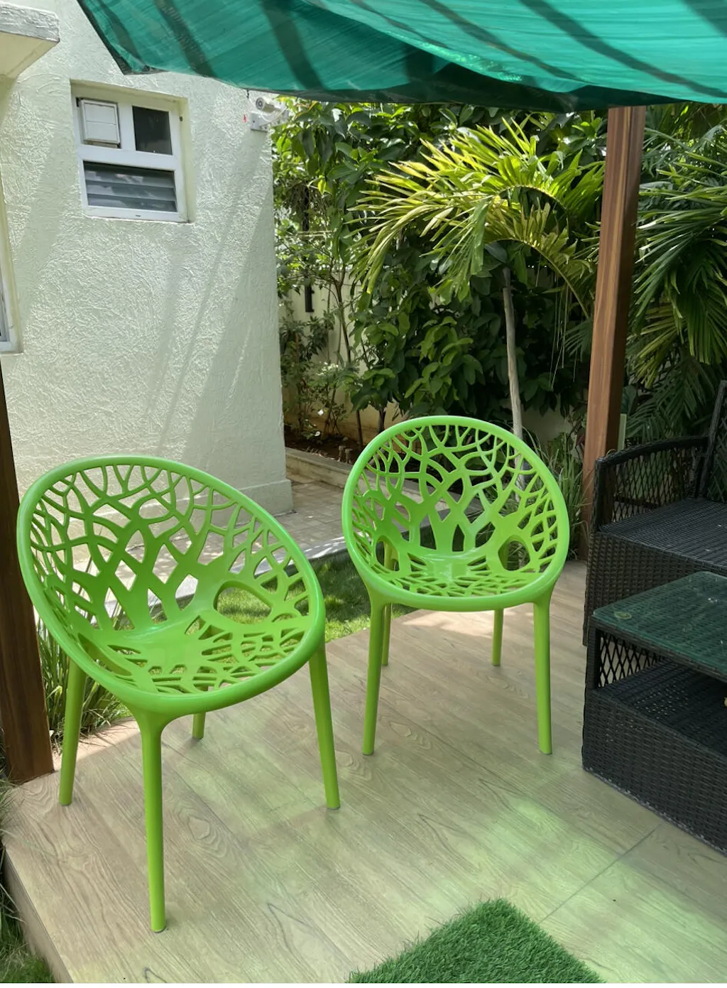 It is very good looking green colour chair we bought and liked very much. Apt for outdoor sitting