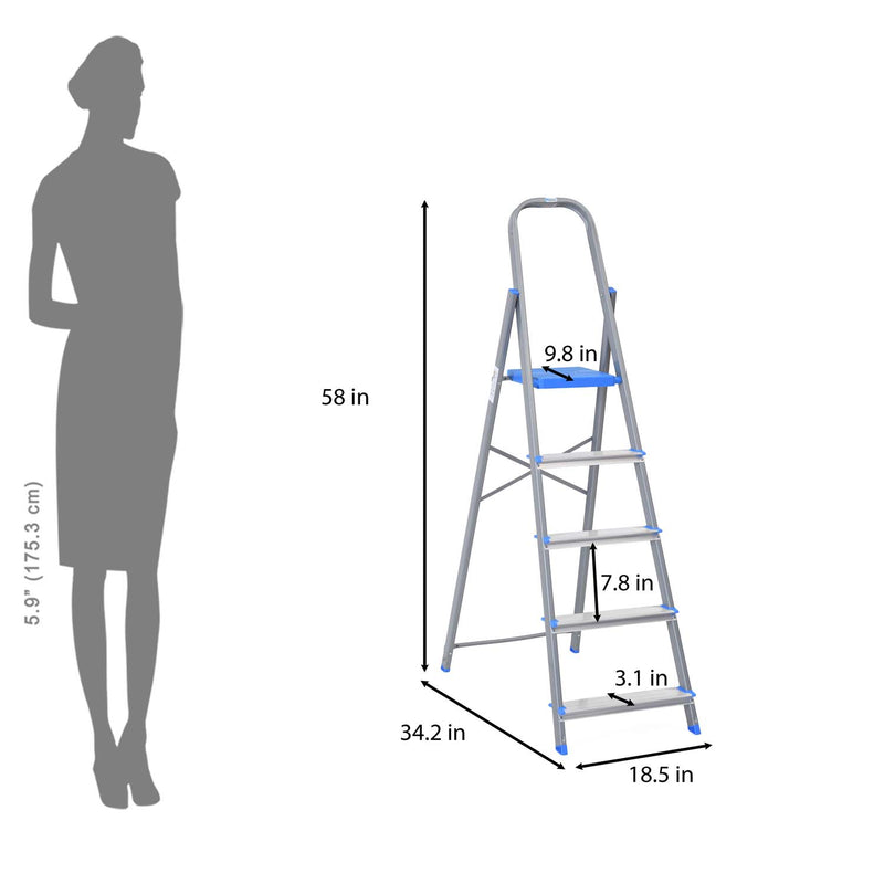 | Make everyday tasks easier with this foldable Nilkamal Rise 5 Step Heavy Duty Steel Ladder. Its space-saving design is easy to handle and store, while supporting up to 150 kg for safe, reliable use. Anti-slip aluminium steps provide a firm grip, and the comfortable plastic top step lets you stand securely for longer. Made with a strong steel frame and durable aluminium steps, this ladder is perfect for cleaning, reaching cabinets, changing bulbs, and other home tasks. |