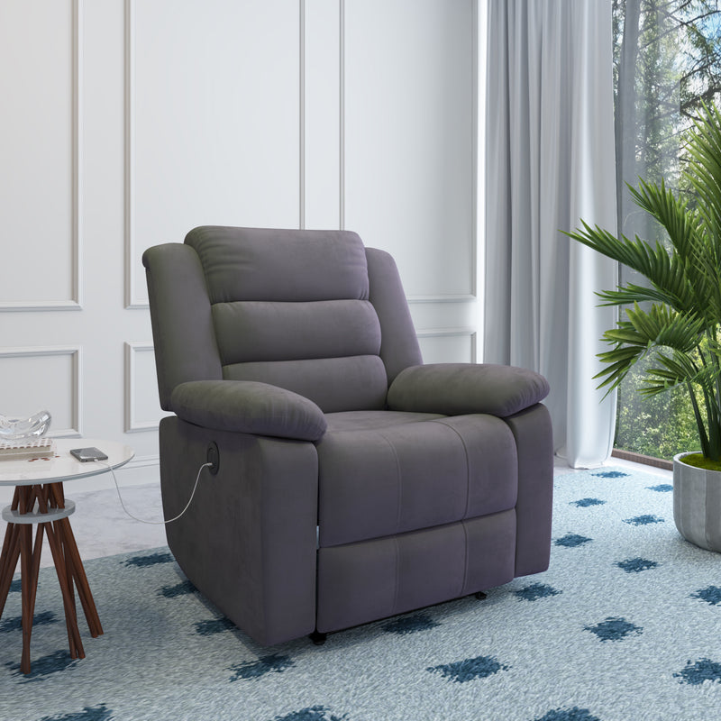 | The Nilkamal Sierra Electric Recliner Sofa brings bold, contemporary design into your living space, instantly elevating your décor with its elegant presence. Designed for modern comfort, it features a smooth electric reclining system with infinite lock positions, allowing you to personalise your seating angle at the touch of a button. Built-in USB and Type-C charging ports keep your devices powered without interrupting your relaxation. Deep ergonomic support comes through generously padded armrests, a high backrest, and contoured lumbar zones that provide full-body comfort. Segmented cushioning enhances posture by supporting the neck, back, and legs, while high-density pocket springs respond to every shift in position for continuous ease. Upholstered in premium velvet and supported by a robust pine wood and engineered wood frame, this recliner blends sophistication with enduring strength. |
